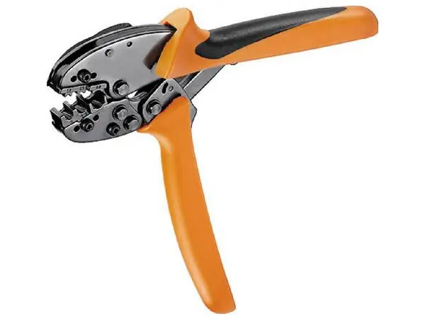 Características: cuerpo de alicate de acero, con tope para el posicionamiento exacto de los contactos. El bloqueo forzado garantiza el engaste de calidad. Posibilidad de desbloqueo en caso de un posible manejo erróneo, homologado conforme a DIN EN 60352 T.1 (prensado sin gas). Mangos con fundas de plástico. Para trabajar por el lateral.