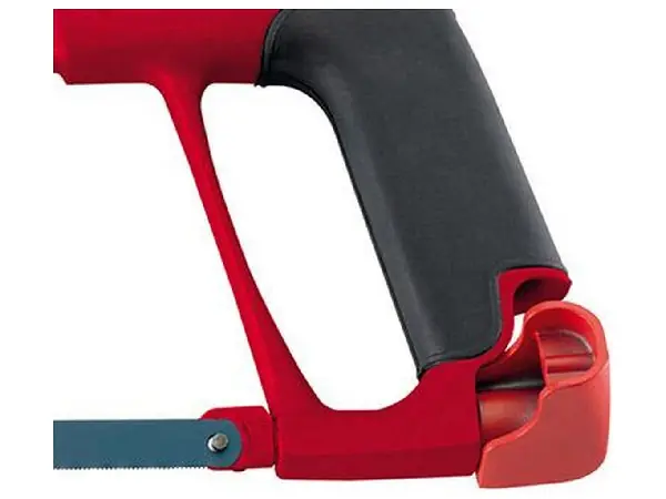 Características: Arco de sierra robusto de fundición a presión de aluminio, recubierto de polvo de epoxi, asidero y mango frontal con revestimiento de caucho para un buen agarre, con protección delantera antideslizamiento. Tensión de hoja ajustable mediante pomo giratorio en el mango de pistola. Suministro con hoja de sierra bimetálica, 24 dientes por pulgada.