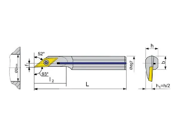 Características: Barra de mandrinar para plaquitas de corte 7° positivas, sujeción mediante tornillo, portaherramientas niquelado.