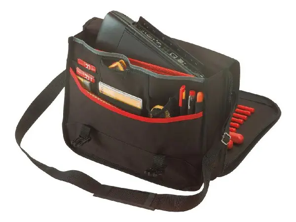 Bolsa portaherramientas/portátil Características: De poliéster, con asa de transporte y correa ajustable. Provista de 10 compartimentos interiores y exteriores, 1 compartimento grande para documentos y 1 compartimento acolchado reforzado para, p. ej., portátiles. Se suministra vacío.