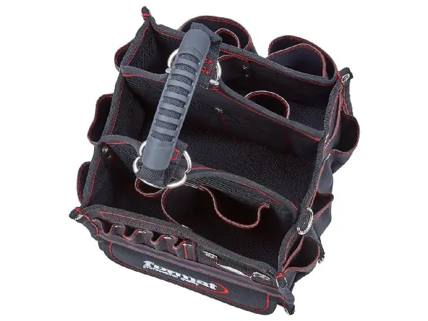 Bolsa portaherramientas, nailon, 20 l Características: De tejido de nailon ligero y resistente a la rotura y al desgaste (1680 denier), negro. Impermeable, transpirable y fácil de limpiar. Se suministra vacío. Con asa de transporte. Provisto de: 27 compartimentos de inserción de diferentes tamaños 4 lazos de sujeción 3 ojales de soporte 1 mosquetón para llaves 1 caja de plástico para piezas pequeñas 1 clip para cinta métrica