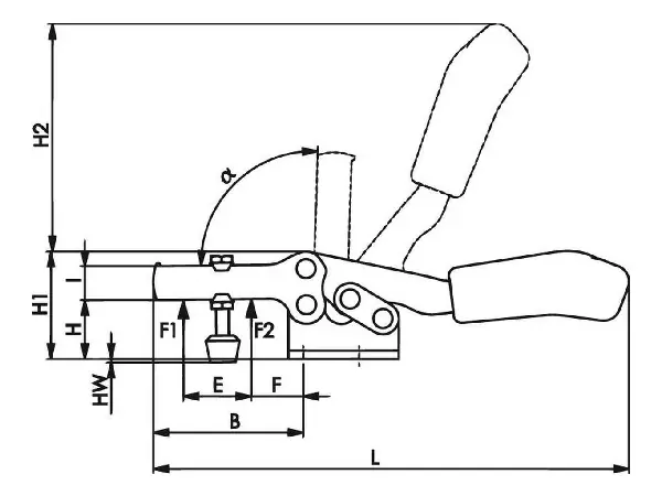 Características: tensor horizontal con fuerzas de retención elevadas, brazo de retención abierto y pie horizontal. Galvanizado y pasivado con remaches de acero inoxidable y puntos de apoyo engrasados. Mango resistente al aceite con gran superficie de apoyo. Tensor de seguridad con cierre para el tornillo de presión en el extremo del brazo de sujeción.
