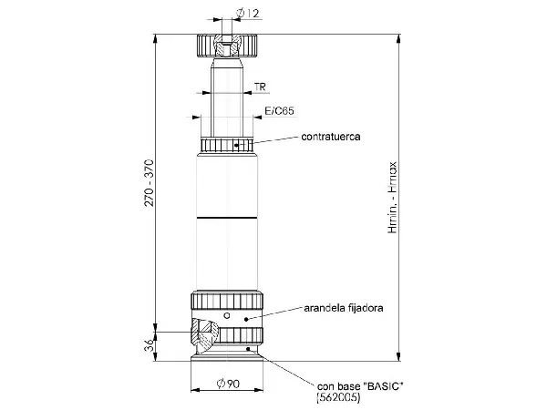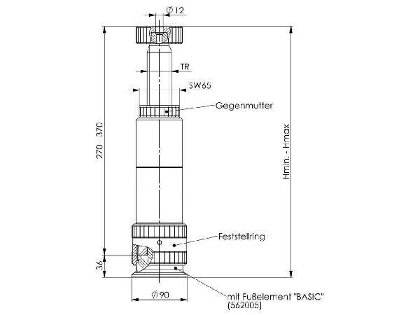 Calzo de rosca Características: Con contratuerca, agujero de centrado de 12 mm de diámetro. Husillo con rosca trapezoidal fabricado en acero bonificado, cabeza del husillo pavonada. Cuerpo y base de acero bonificado, pavonado. Aplicación: Puede utilizarse en ranuras en T y placas de rejilla mediante adaptadores que se atornillan al elemento base. Los elementos individuales se conectan entre sí de forma fiable mediante un anillo roscado. La herramienta de montaje permite la operación de la contratuerca y la base, así como los adaptadores de rosca. Nota: El uso como cabezal en el calzo de rosca modular permite una altura máxima de 1620 mm con una fuerza de apoyo admisible de 60 kN. Por encima de este valor, existe el riesgo de pandeo. No ajustar bajo carga.