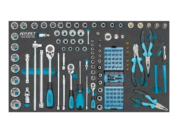 Carro de taller tipo 179NXL-7 con surtido de 265 piezas Características: Construcción robusta de chapa de acero con 7 cajones de extracción unilateral (5 x 77; 2 x 162 mm de altura), con guías sobre bolas, totalmente extraíbles, bloqueo central y final, así como cierre individual contra abertura no intencionada durante la marcha, con autocierre. La versión básica viene equipada con un separador en cada cajón. Los laterales disponen de una perforación cuadrada, los componentes quedan protegidos contra los golpes gracias a los laterales instalados de acuerdo al tamaño del carro. Cierre centralizado mediante cerradura de bombillo. Encimera de acero inoxidable resistente a los disolventes. Con ruedas fijas grandes, de alta resistencia y que no dejan huella (Ø 125 mm), 2 de ellas orientables (Ø 125 mm), con freno de rueda (parada total) en ambos lados para garantizar la estabilidad en cualquier dirección. Todas las ruedas vienen provistas de protección contra hilos que protege los alojamientos de la suciedad y los hilos. Todas las esquinas de los laterales del vehículo están provistos con protegecantos continuos. Superficie con recubrimiento de polvo resistente al rayado, cuerpo de color azul Hazet, cajones de color negro. Volumen de suministro: 1 módulo de herramientas destornilladores, 57 piezas compuesto por: 2 destornilladores planos 3,5; 5,5 mm 2 destornilladores de estrella PH 1; 2 5 destornilladores planos 4; 5,5; 6,5; 8; 10 mm 4 destornilladores de estrella PH 0; 1; 2; 3 1 juego de destornilladores para electrónica planos y de estrella de 7 piezas 1 juego de destornilladores para electrónica hexágono hembra de 7 piezas 4 destornilladores planos 3; 4; 5,5; 6,5 mm 2 destornilladores de estrella PH 1; 2 6 destornilladores TORX® interior T 10; 15; 20; 25; 27; 30 1 detector de tensión 1 juego de llaves Allen hexágono hembra, de 9 piezas, 1,5–10 mm 1 juego de llaves Allen TORX® interior, 8 piezas 1 módulo de herramientas llaves para tornillos, de 45 piezas, compuesto por: 8 llaves fija doble 6 x 7; 8 x 9; 10 x 11; 12 x 13; 14 x 15; 16 x 17; 18 x 19; 21 x 22 mm 17 llaves combinadas 6; 7; 8; 9; 10; 11; 12; 13; 14; 15; 16; 17; 18; 19; 21; 22; 24 mm 12 llaves de boca con carraca 8; 9; 10; 11; 12; 13; 14; 15; 16; 17; 18; 19 mm 8 llaves de estrella doble 6 x 7; 8 x 9; 10 x 11; 12 x 13; 14 x 15; 16 x 17; 18 x 19; 21 x 22 mm 1 módulo de herramientas de atornillado de 138 piezas, compuesto por: 1 carraca reversible 1/4" 9 vasos para llave de vaso hexagonal 1/4" 5,5; 6; 7; 8; 9; 10; 11; 12; 13 mm 5 vasos para llave de vaso de 1/4" para tornillos TORX® E 5; 6; 7; 8; 10 7 puntas para destornillador 1/4" con recubrimiento de TiN, TORX® interior T 10; 15; 20; 25; 27; 30; 40 2 alargaderas 1/4" 55; 147 mm 1 junta cardán de 1/4" 1 portapuntas 1/4" 1 adaptador para puntas de 1/4" 1 carraca reversible de 3/8" 12 vasos para llave de vaso hexagonal 3/8" 10; 11; 12; 13; 14; 15; 16; 17; 18; 19; 21; 22 mm 3 alargaderas 3/8" 74; 150; 254 mm 1 junta cardán de 3/8" 1 pieza reductora 3/8" a 1/4" 1 carraca reversible 1/2" 20 vasos para llave de vaso hexagonal 1/2" 10; 11; 12; 13; 14; 15; 16; 17; 18; 19; 20; 21; 22; 23; 24; 26; 27; 28; 30; 32 mm 6 vasos para llave de vaso de 1/2" para tornillos TORX® E 10; 12; 14; 16; 18; 20 5 puntas para destornillador de 1/2" con recubrimiento de TiN, TORX® interior T 30; 40; 45; 50; 55 1 mango en T con pieza corrediza de 1/2" 1 pieza reductora de 1/2" a 3/8" 1 pieza reductora 3/4" a 1/2" 2 alargaderas 1/2" 123; 248 mm 1 junta cardán de 1/2" 1 alicate universal 160 mm 1 cortaalambres de fuerza 180 mm 1 alicate de boca semirredonda, acodado, 200 mm 1 alicate de pico de loro 260 mm 1 surtido de puntas de 1/4" de 51 piezas compuesto por: 1 portapuntas de cambio rápido 4 planas 0,5 x 4,0; 0,6 x 4,5; 0,8 x 5,5; 1,0 x 6,0 mm 10 estrella PH 1 (4 unidades); 2 (4 unidades); 3 (2 unidades) 7 puntas de estrella PZ 1 (3 unidades); 2 (3 unidades); 3 6 hembra hexagonal 2; 2,5; 3; 4; 5; 6 mm 17 TORX® interior T 6; 7; 8; 9; 10; 15 (2 unidades); 20 (2 unidades); 25 (2 unidades); 27 (2 unidades); 30 (2 unidades); 40 (2 unidades) 6 TORX®BO interior con orificio T 10; 15; 20; 25; 27; 30 1 juego de brocas espirales 25 piezas Ø 1-13 mm y aumento de 0,5 mm