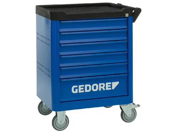 Carro de taller workster smartline, con 6 cajones Características: construcción robusta de chapa de acero, cajones totalmente extraíbles con guías sobre bolas y bloqueo de seguridad con una mano, todos los cajones pueden dividirse de forma personalizada. Perforación cuadrada bilateral de (10 x 38 mm) para colocar las distintas piezas accesorias. Cierre centralizado mediante cerradura de bombillo. Superficie de trabajo de polipropileno con pequeños compartimentos para piezas pequeñas, achatamiento frontal y borde protector de ruedas. 2 ruedas de deslizamiento ligero situadas debajo sin que sobresalgan, así como 2 ruedas orientables, una de ellas con freno de rueda (parada total). Superficie recubierta con polvo resistente al rayado. Con 6 cajones extraíbles unilateralmente (5 x 80; 1 x 160 mm de altura).