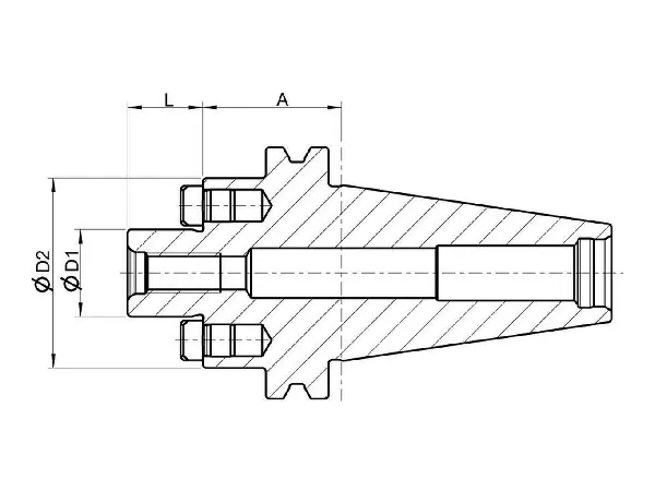 Alojamiento para cabezales portacuchillas, DIN 69871, forma AD, SK 40 Características: De acero para trabajo en caliente. Tolerancia del ángulo de conicidad: AT3 Templado: 54 –2 HRC Aplicación: Para el alojamiento de cabezales de corte y fresas con ranura transversal conforme a DIN 1880. Volumen de suministro: Alojamiento completo para cabezal portacuchillas con tornillo de apriete de fresa.