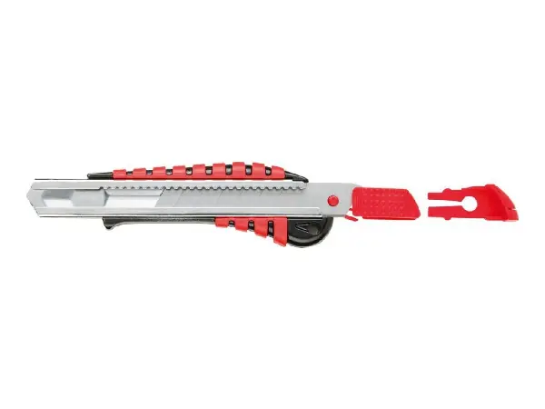 Cúter Características: Carcasa de fundición a presión de cinc con inserción de goma, guía de hoja de metal y depósito de hojas. Fijación de la hoja mediante pulsador. Se suministra con 1 hoja seccionable. Nota: El artículo está sujeto al art. 42a de la Ley de Armas alemana. Solo puede utilizarse para la finalidad profesional y debe transportarse en un contenedor cerrado.