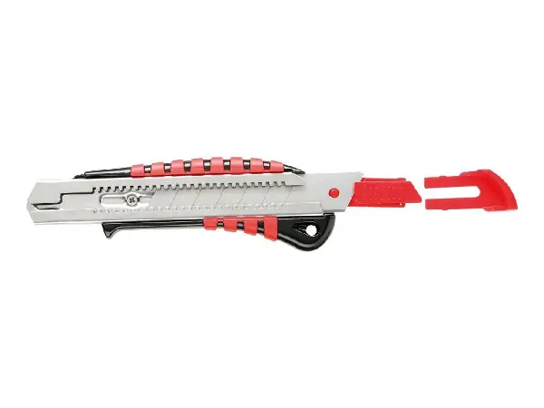 Cúter Características: Carcasa de fundición a presión de cinc con inserción de goma, guía de hoja de metal y depósito de hojas. Fijación de la hoja mediante pulsador. Se suministra con 1 hoja seccionable. Con ruedecilla de ajuste adicional para la fijación de la hoja. Nota: El artículo está sujeto al art. 42a de la Ley de Armas alemana. Solo puede utilizarse para la finalidad profesional y debe transportarse en un contenedor cerrado.