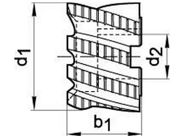 Fresa cilíndrica frontal, tipo NR, con dientes para desbastado, con recubrimiento de TiAlN Características: perfil rectificado, con ranura longitudinal y transversal Aplicación: se puede utilizar como fresa de planear, de cantos y cilíndrica. Velocidad de corte aprox. un 50% superior a la de herramientas sin recubrimiento. Apta para el mecanizado en seco.