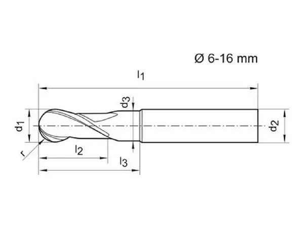 Fresa esférica metal duro integral Características: Con corte al centro, adecuada para taladrar. Aplicación: Se puede utilizar para el fresado de copiado. El cuello rebajado permite optimizar el alcance de la herramienta, por lo que está especialmente indicada para su aplicación en la construcción de moldes. La duración de la vida útil de la herramienta se incrementa con una refrigeración MMS o por aire. La herramienta puede utilizarse con un husillo en ángulo o recto. Adecuada para el mecanizado HSC hasta 62 HRC. Nota: Fresado de copiado; valores de corte preferentes en ap = 0,05 x d1 y ae = 0,1 x d1.