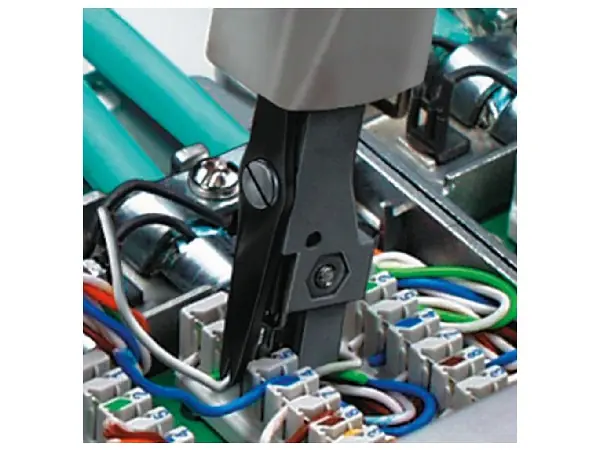 Herramienta de aplicación Características: carcasa de plástico, con gancho para estirar y lengüeta liberadora integrados Aplicación: herramienta de presión para conectores, bloques y paneles. Prensar y cortar sin esfuerzo en la misma operación, para cables UTP y STP con diámetro de conductor 0,4–0,8 mm.
