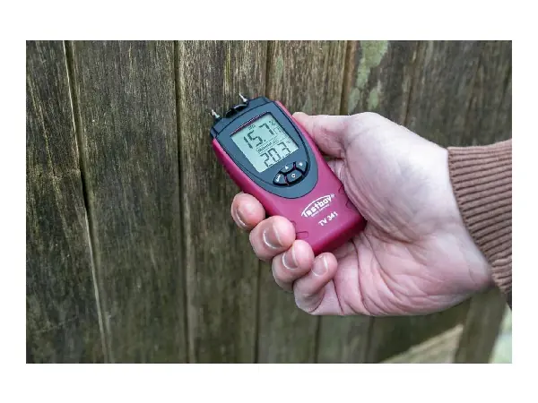 Higrómetro TV 341 Características: Carcasa de plástico ABS. Sin cables de medición o sondas de medición por separado. Con unidad de autocomprobación integrada. Funciones: Desconexión automática. Aplicación: Mide el contenido de humedad en materiales de construcción como, p. ej., madera aserrada, madera contrachapada, tableros de viruta aglomerada, chapado, yeso encartonado o enlucido. Volumen de suministro: Medidor de humedad con 3 pilas AAA/LR03, 1,5 V, y funda de transporte.