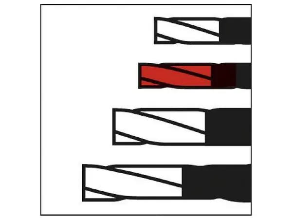 Características: Torsión y paso desiguales, puntas de corte con bisel angular de corte de 45° con cámaras de virutas ampliadas.