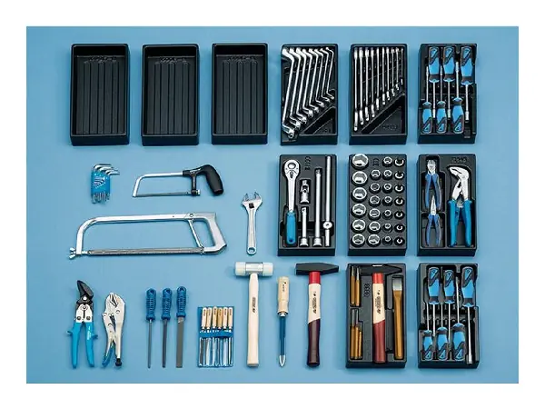 Armario de herramientas n.º 1400 G, de 100 piezas Contenido del juego: 8 llaves de estrella doble 6 x 7; 8 x 9; 10 x 11; 12 x 13; 14 x 15; 16 x 17; 18 x 19; 20 x 22 mm 10 llaves de dos bocas 6 x 7; 8 x 9; 10 x 11; 12 x 13; 14 x 15; 16 x 17; 18 x 19; 20 x 22; 21 x 23; 24 x 27 mm 19 vasos para llave de vaso hexagonal 1/2" 10; 11; 12; 13; 14; 15; 16; 17; 18; 19; 21; 22; 23; 24; 26; 27; 28; 30; 32 mm 7 puntas para destornillador 1/2", hembra hexagonal 6; 7; 8; 9; 10; 12; 14 mm 1 carraca reversible 1/2" 2 alargaderas 1/2" 125; 250 mm 1 junta cardán de 1/2" 1 mango en T con pieza corrediza de 1/2" 6 llaves de vaso con mango en 5,5; 6; 7; 8; 9; 10 mm 10 llaves Allen hexagonales 1,3; 1,5; 2; 2,5; 3; 4; 5; 6; 8; 10 mm 1 llave de una boca regulable hasta 25 mm 1 tenazas grip, 240 mm 1 alicate de pico de loro, 250 mm 4 destornilladores, planos 4; 4,5; 6,5; 8 mm 2 destornilladores de estrella PH 1; 2 1 granete, 5 mm 1 botador; 5 mm 1 cortafríos, 250 mm 1 cincel cruciforme, 5 mm 3 extractores de pasadores 1,5; 3; 4 mm 1 sierra de arco para metales 1 sierra de bricolaje 1 lima especial plana, picado 2, 150 mm 1 lima triangular, picado 2, 150 mm 1 lima redonda, picado 2, 150 mm 1 juego de limas para llaves, 6 unidades 1 rasqueta triangular hueca, 150 mm 1 alicate universal de fuerza, 180 mm 1 cortaalambres de fuerza, 160 mm 1 alicate de boca semirredonda, 160 mm 2 martillos de cerrajero 300; 500 g 1 martillo de superficie blanda, Ø 40 mm 1 cizalla de palanca, 250 mm 1 armario de chapa de acero