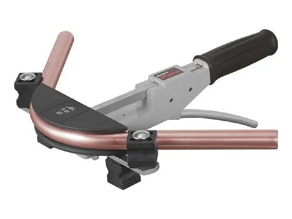 Curvatubos monomanual, con avance de carraca Características: Curvador robusto, manejable con una sola mano con palanca multifuncional para avance y retroceso rápidos. Segmentos de curvado y piezas corredizas estables de forma y resistentes a la presión con elevada capacidad de deslizamiento, de poliamida reforzada con fibra de vidrio altamente resistente. Aplicación: Para el curvado fácil, rápido y preciso de hasta 90° de, p. ej.: Tubos de cobre blandos (también de pared delgada) Ø 10-22 mm Tubos de cobre blandos, revestidos (también de pared delgada) Ø 10-18 mm Tubos de acero al carbono revestidos con sistemas de ajuste a presión Ø 12-18 mm Tubos de acero de precisión blandos Ø 10-18 mm Tubos compuestos Ø 14-32 mm Volumen de suministro: Accionamiento de curvador, segmentos de curvado, 1 soporte de piezas corredizas con piezas corredizas y caja de chapa de acero.