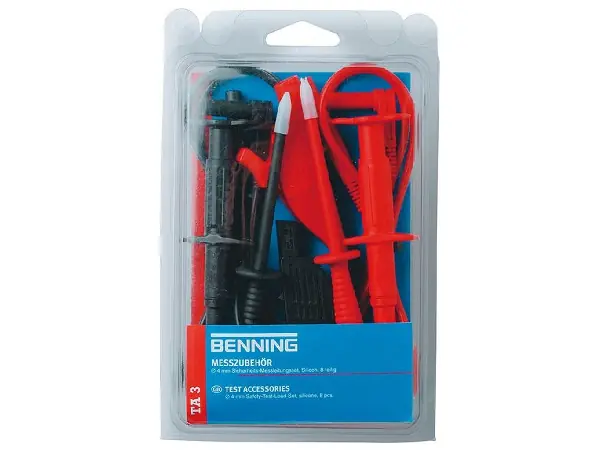 Juego de cables de medición de seguridad TA 3 para multímetro de instrumento de medición digital Características: puntas de medición de Ø 4 mm. Categoría de medición CAT III 1000 V. Contenido: 2 cables de medición de seguridad (silicona) 2 puntas de inspección de seguridad (punta de medición delgada) 2 pinzas de gancho de seguridad 2 pinza de cocodrilo de seguridad