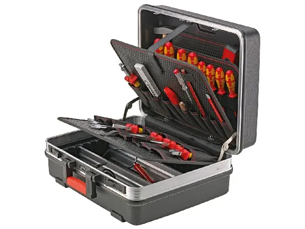 Maleta portaherramientas Características: De plástico ABS a prueba de desgaste y de humedad, de color negro, con paredes duras de plástico especial para una mayor resistencia al rayado, mejor estabilidad dimensional y alta resistencia a la humedad, grasa y productos químicos, así como robusta asa con revestimiento interior cómodo. Bandeja inferior con una altura de 58 mm, subdivisiones variables. Con bisagras de rejilla cubiertas, portatapas de seguridad, maleta con capacidad de carga de hasta 30 kg, marco doble de aluminio con protección contra golpes. Muy estable y con deslizadores protectores integrados. Con cierre mediante 2 cerraduras de cilindro basculantes y 1 candado numérico. Se suministra vacío. Provisto de: 22 compartimentos de inserción en el tablero portaherramientas de 2 caras 14 compartimentos de inserción en la tapa de cierre 1 compartimentos de inserción grande en la tapa de cierre 1 bandeja inferior con tapa de cierre 7 lazos en el tablero de la tapa 1 compartimento para documentos en el tablero de la tapa