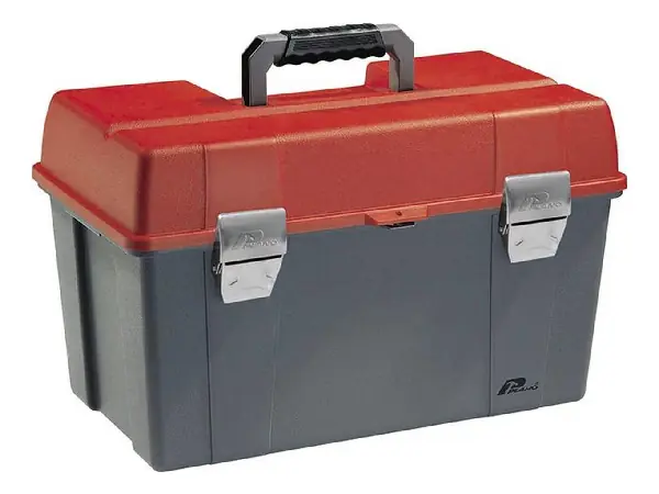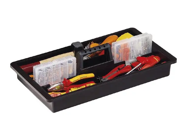Maleta portaherramientas con asa de transporte Características: De plástico resistente a los golpes. Con asa de transporte extraíble para pequeñas piezas y herramientas sueltas. Asa con revestimiento de goma. Se suministra vacío.