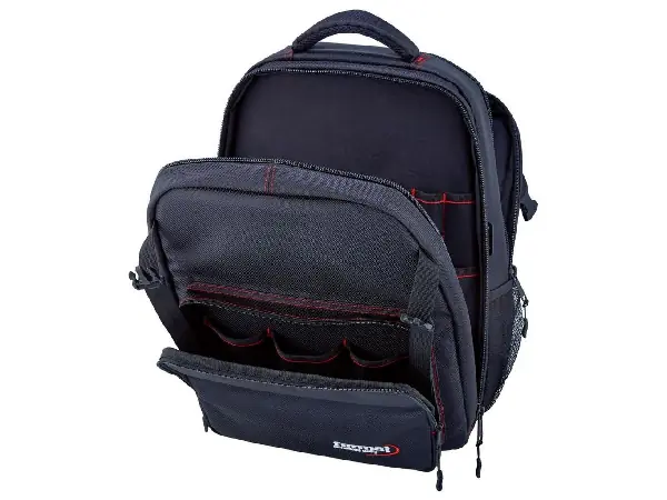 Mochila portaherramientas, nailon Características: De tejido de nailon ligero, resistentes al desgarre y al desgaste (1680 Denier), de color negro, con parte trasera acolchada y pared intermedia reforzada. Impermeable, transpirable y fácil de limpiar. Con correa de hombro ajustable y acolchada. Se suministra vacío. Provisto de: 2 compartimentos principales grandes con cremalleras 5 compartimentos de inserción en el compartimento trasero 24 compartimentos de inserción en el compartimento delantero 1 compartimento delantero grande superpuesto con cremallera 2 bolsillos laterales