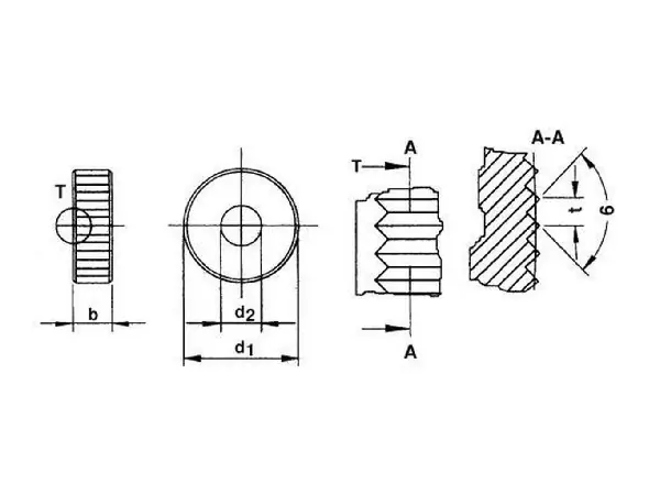 Moleta, forma AA paralela al eje (recta) Características: metal pulverizado, DIN 403 y con biselado. Los dientes están fresados. Aplicación: para moletear (conformación sin arranque de virutas). Agujero escalonado.