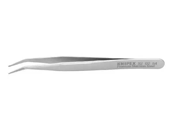 Pinzas de precisión para montaje con puntas acodadas y anchas, para tecnología SMD, acero de cromo-níquel Características: con superficies de agarre lisas. Mateado antideslumbrante. Aplicación: para trabajos universales de precisión. Características: De acero inoxidable y antimagnético. Con superficies de agarre lisas, sin reflejos y mate, para un agarre óptimo, y puntas en ángulo, de aproximadamente 0,85 mm de ancho. Adecuadas para tecnología SMD. Para agarrar componentes cilíndricos de Ø 0,6 mm. Aplicación: Para trabajos universales de precisión.