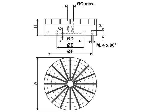 Características: sistema magnético de neodimio con graduación polar radial y de estrella. La fuerza magnética es infinitamente variable. Las ranuras de centraje permiten alinear fácilmente las piezas de trabajo. Puede realizarse en el centro un agujero pasante (de Ø C).