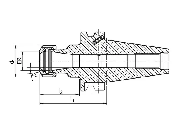 Portapinzas tipo ER, BT 40 Características: equilibrado con precisión. De aleación de acero cementado, con una resistencia a la tracción en el núcleo de aprox. 950 N/mm² y una profundidad de temple de mín. 0,5 mm.Todas las superficies funcionales con mecanizado de precisión y calidad garantizada a través de controles 100% dobles. Tolerancia del cono: AT3 Templado: 60 –2 HRC Aplicación: para la sujeción de herramientas con vástago cilíndrico en pinzas de sujeción conforme a ISO (antes DIN 6499). Volumen de suministro: portapinzas completo con tuerca de sujeción (equilibrado, con recubrimiento deslizante para mayor fuerza de sujeción). Nota: la medida I2 indica la profundidad de inserción máxima para herramientas.