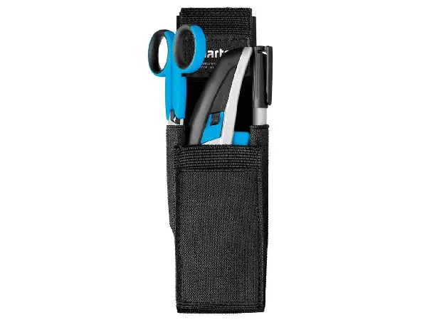 Riñonera para cuchillas Características: De nailon resistente, con costuras dobles, se puede lavar a 40°. La bolsa está subdividida en compartimento principal, bolsillo delantero y dos ranuras. Fijación mediante clip o cierre de velcro. Se suministra vacío. Aplicación: Para guardar y transportar herramientas de corte. Con bolsillo interior adicional.