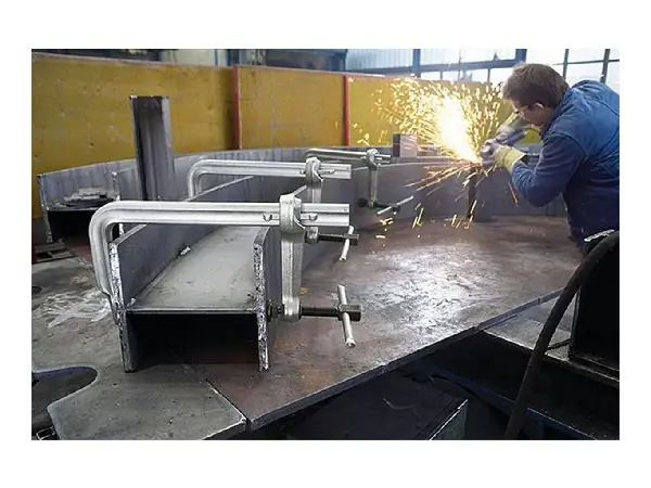 Sargento para construcciones de acero Características: guía de deslizamiento, mandíbula fija y placa de apriete en una pieza de acero perfilado estirado en frío y optimizado estáticamente, mandíbula móvil de acero bonificado galvanizado forjado, husillo de marcha suave con rosca trapezoidal laminada, fosfatada y templada en frío. Placa de apriete de alto rendimiento resistente al calor con gran punta esférica, orientable hasta 35° e intercambiable, con armadura de acero sinterizado templado e impregnado de aceite. Con muletilla insertada y hexágono para sujetar con llaves de apriete, llaves de vaso, llaves dinamométricas o carracas. Aplicación: utilizable especialmente para fuerzas de apriete de hasta 22 kN. Es decir, en todos los ámbitos del trabajo de metal y en la construcción de acero.