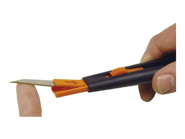 Escalpelo Características: Mango de ABS, azul oscuro, con mecanismo de deslizamiento. Hoja recta, con recubrimiento de TiN. Con mecanismo de apriete para cambiar fácilmente la hoja.