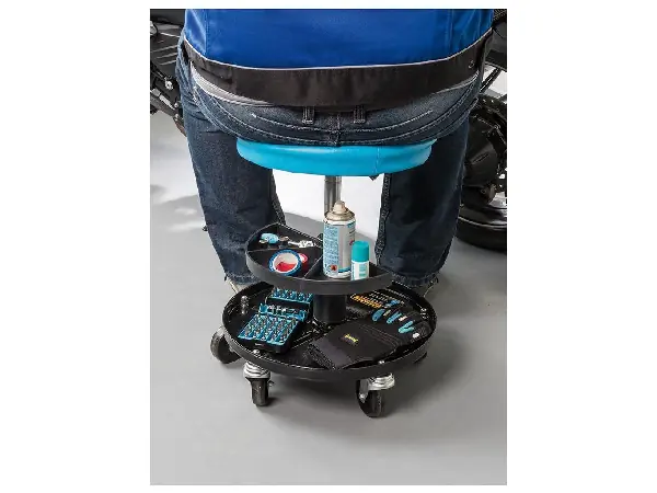 Características: taburete con ruedas y superficie de asiento acolchada, regulación de altura neumática y cinco ruedas orientables grandes de marcha suave con superficies de goma, antivuelco. Con bandejas para herramientas, una gira 360°.