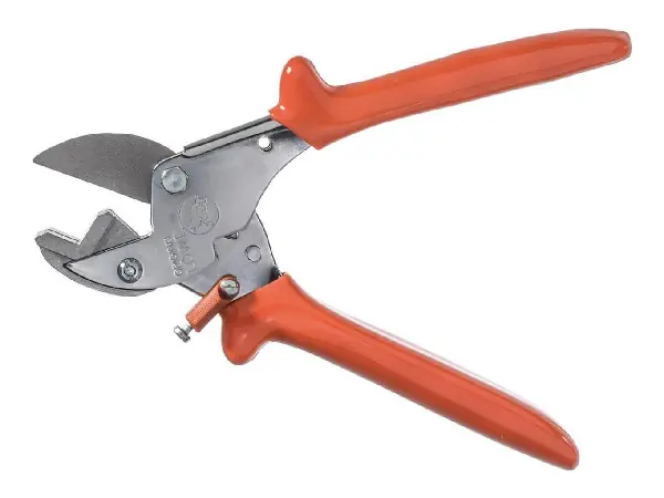 Tijera para perfiles Características: Cuerpo de chapa de acero, cromado, hojas de acero especial, rectificadas mediante CNC, con protección anticorrosión y revestimiento antiadherente, tope de fundición a presión de cinc. El principio original de Löwe consiste en realizar un corte oblicuo contra un tope fijo. Mangos con funda de plástico y protección antideslizante. Aplicación: Para cortar de forma sencilla y limpia perfiles de plástico, tubos flexibles, tubos de plástico y tubos compuestos de varias capas.