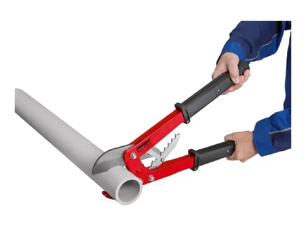 Cizalla de tubos de plástico Picco P 75 P Características: Hoja templada, intercambiable, con rectificado especial. Apoyo de tubo ancho para un corte perpendicular preciso sin rebabas. Aplicación: Para cortar con precisión con una sola mano, de forma rápida y sencilla tubos de plástico y tubos compuestos. Cuerpo de acero muy robusto, mangos con fundas de plástico con transmisión especial de carraca.